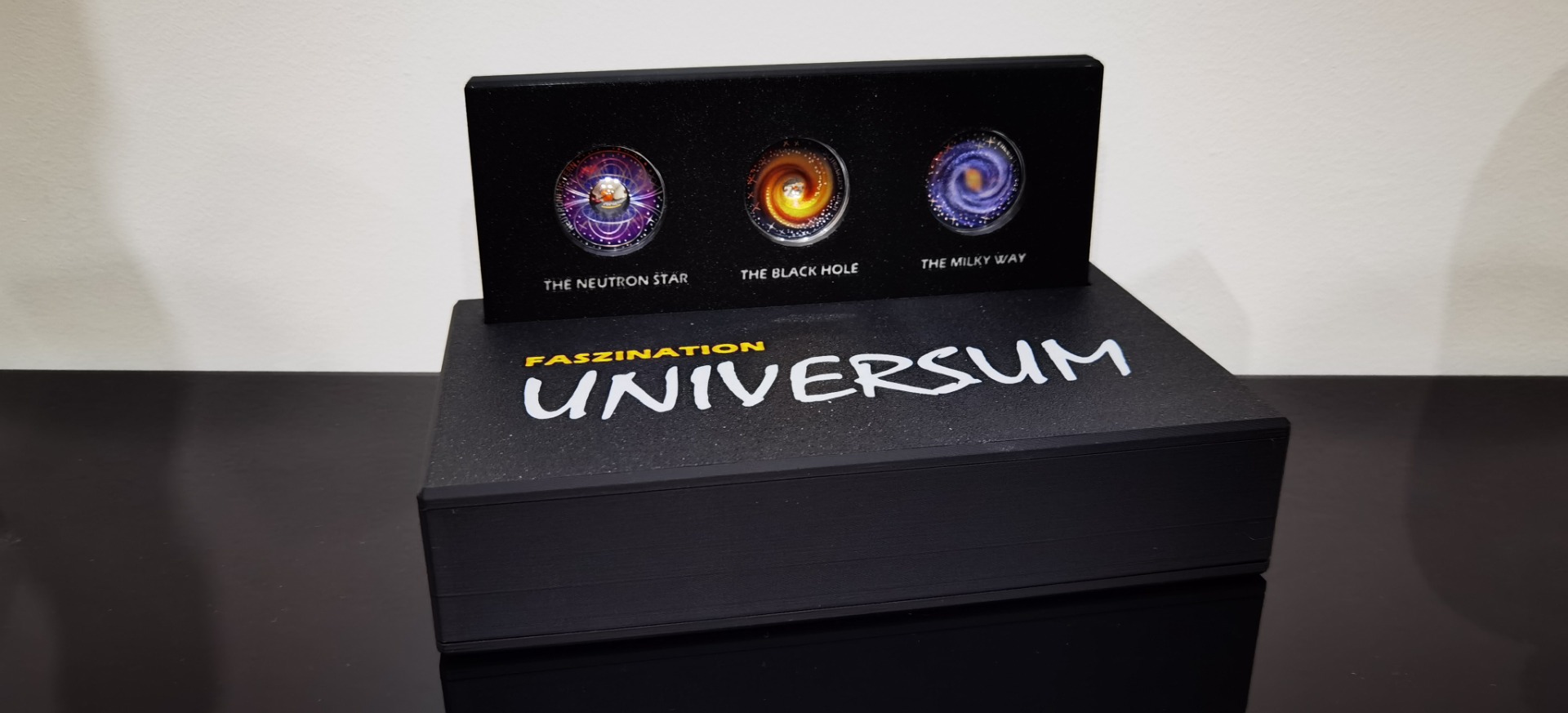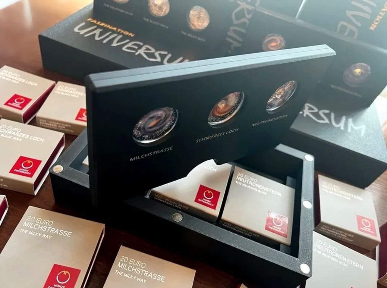 Caixa/Expositor para a Coleção de Moedas de Prata da Áustria "A Beleza do Universo" Descrição: Esta elegante caixa/expositor foi especialmente concebido para albergar e exibir a sua valiosa coleção de moedas de prata da Áustria, série "A Beleza do Universo". Com um design requintado, a caixa/expositor protege e valoriza cada moeda, proporcionando uma apresentação impressionante.